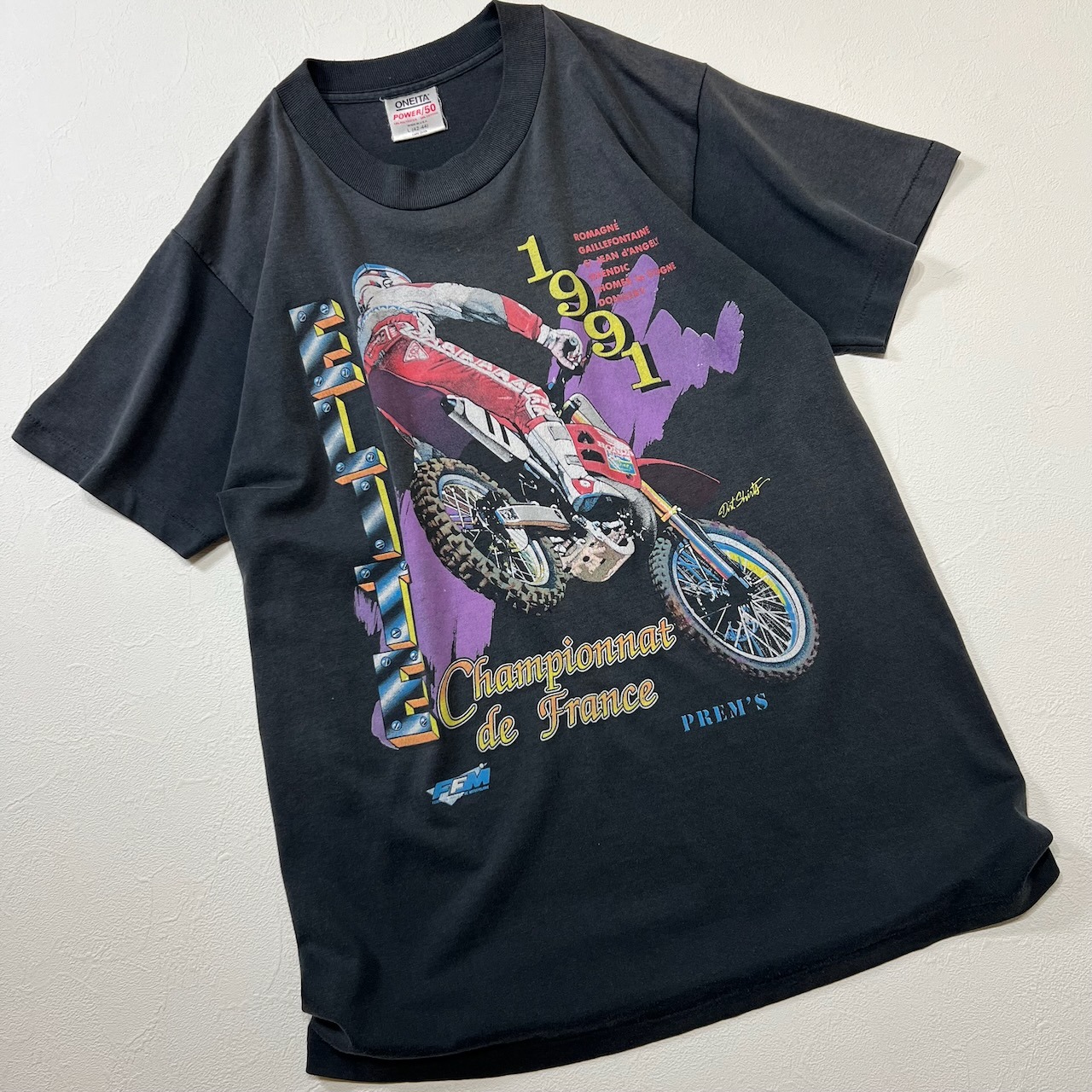 90s USA ONEITA シングルステッチ フェード 両面プリント Tシャツ オニータ ブラック L 古着