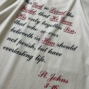 バックプリントにはキリスト教の聖書の一節、ヨハネによる複音。