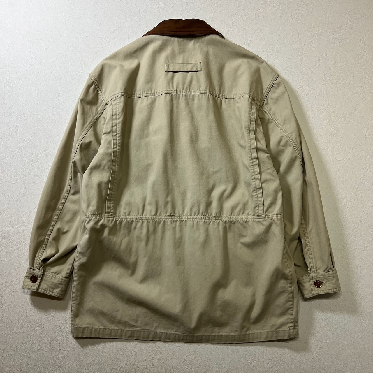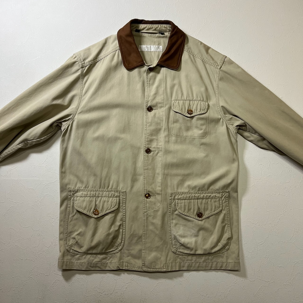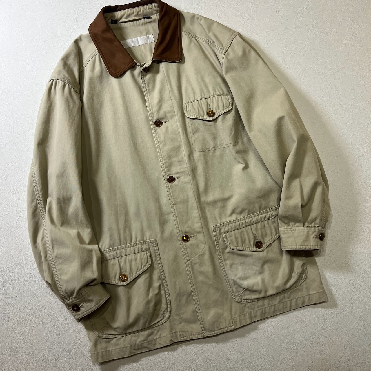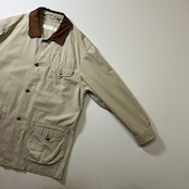 90s PERRY ELLIS 襟レザー ワークジャケット カバーオール ペリーエリス ライトベージュ L 古着