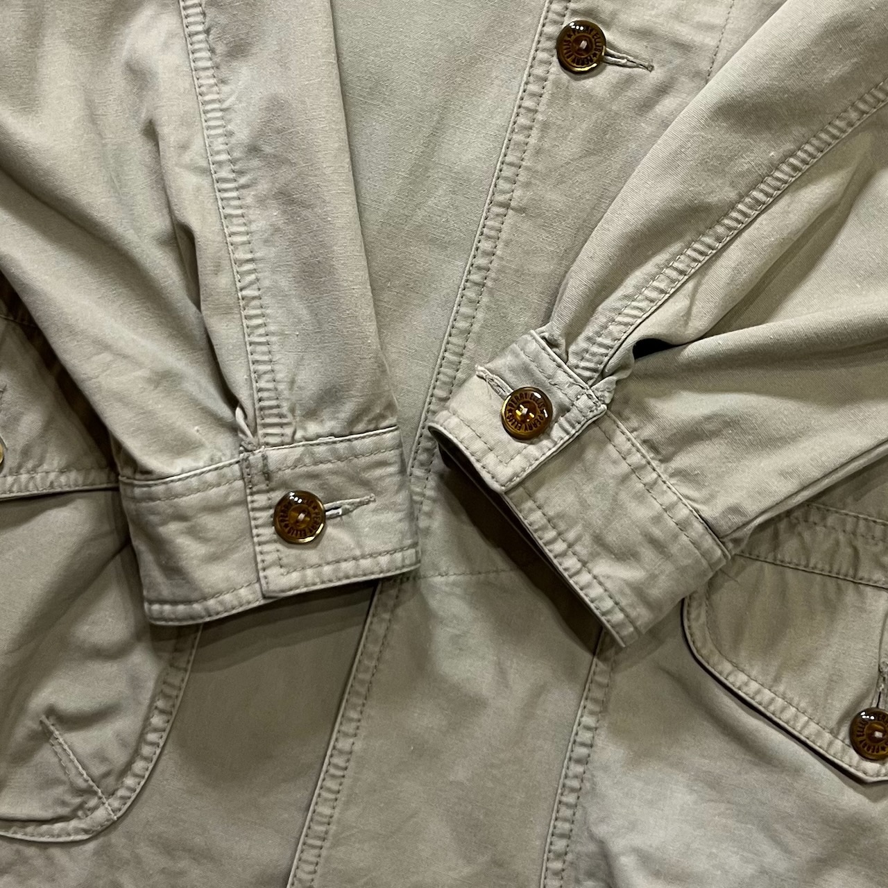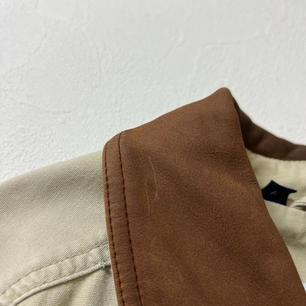 【 追記 】 : 着用感・襟のレザー部分に傷・左ポケット脱色・背面裾着色・袖にシミ・画像参照