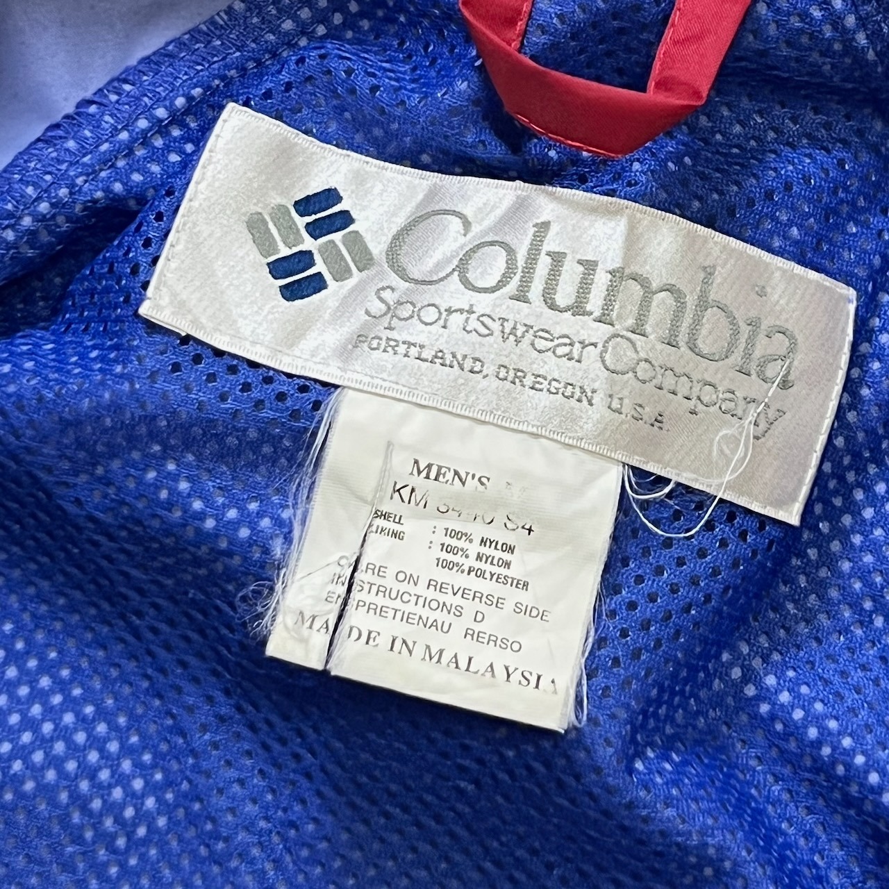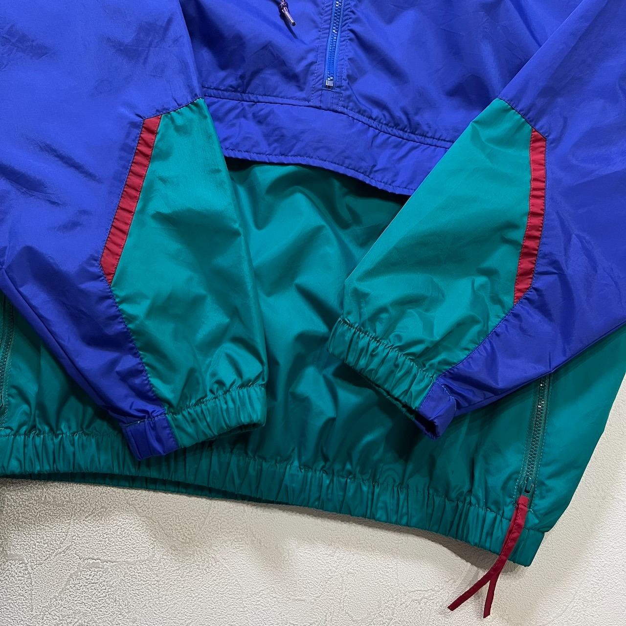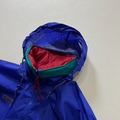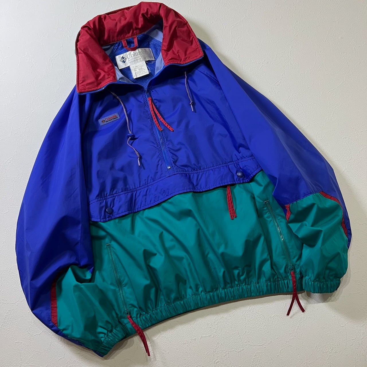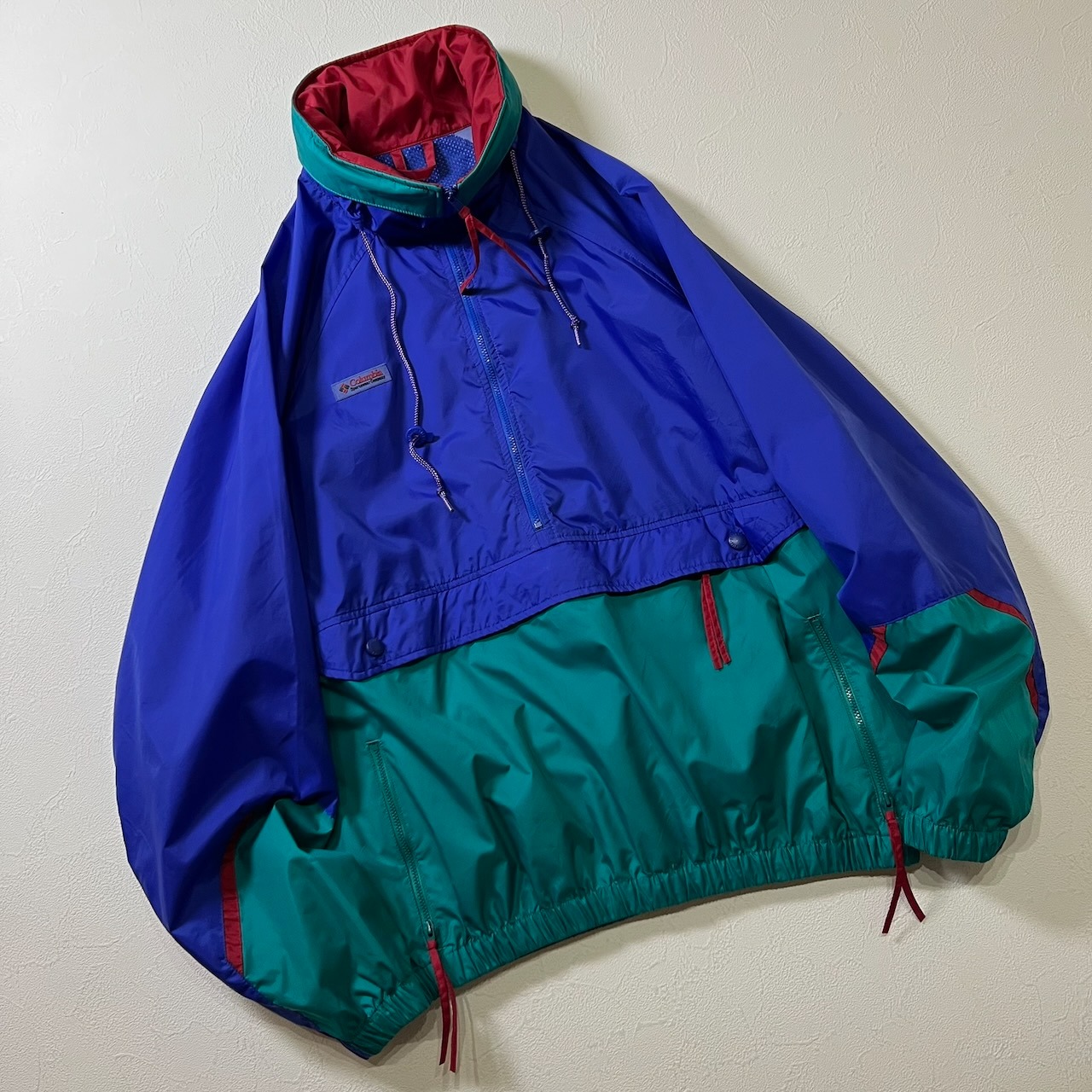90s Columbia ナイロン ラグラン マルチカラー 隠しフード アノラックパーカー コロンビア ブルー グリーン M 古着