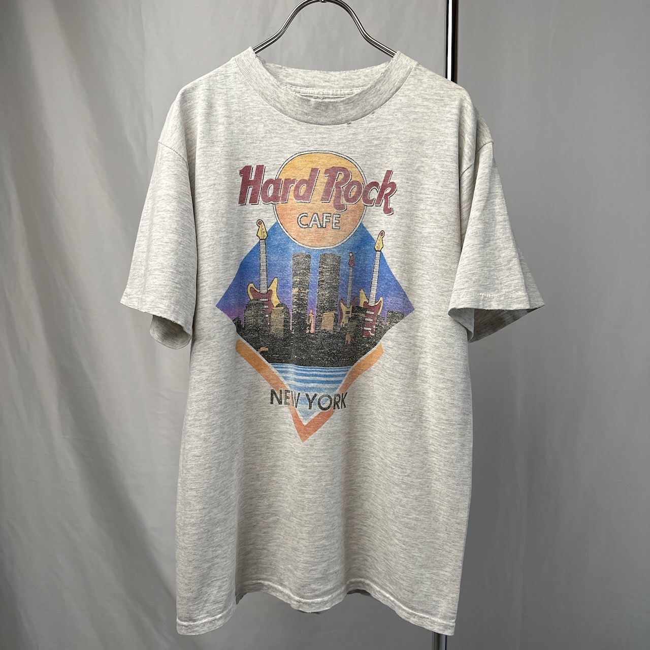 1990年代のハードロックカフェのロゴがプリントされた霜降りグレーの雰囲気抜群なダメージがある半袖Tシャツです。